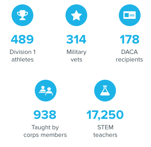 Today, 4,100 corps members reach over 270,000 students in more than 1,800 schools across America. They teach all grade levels and subject areas.